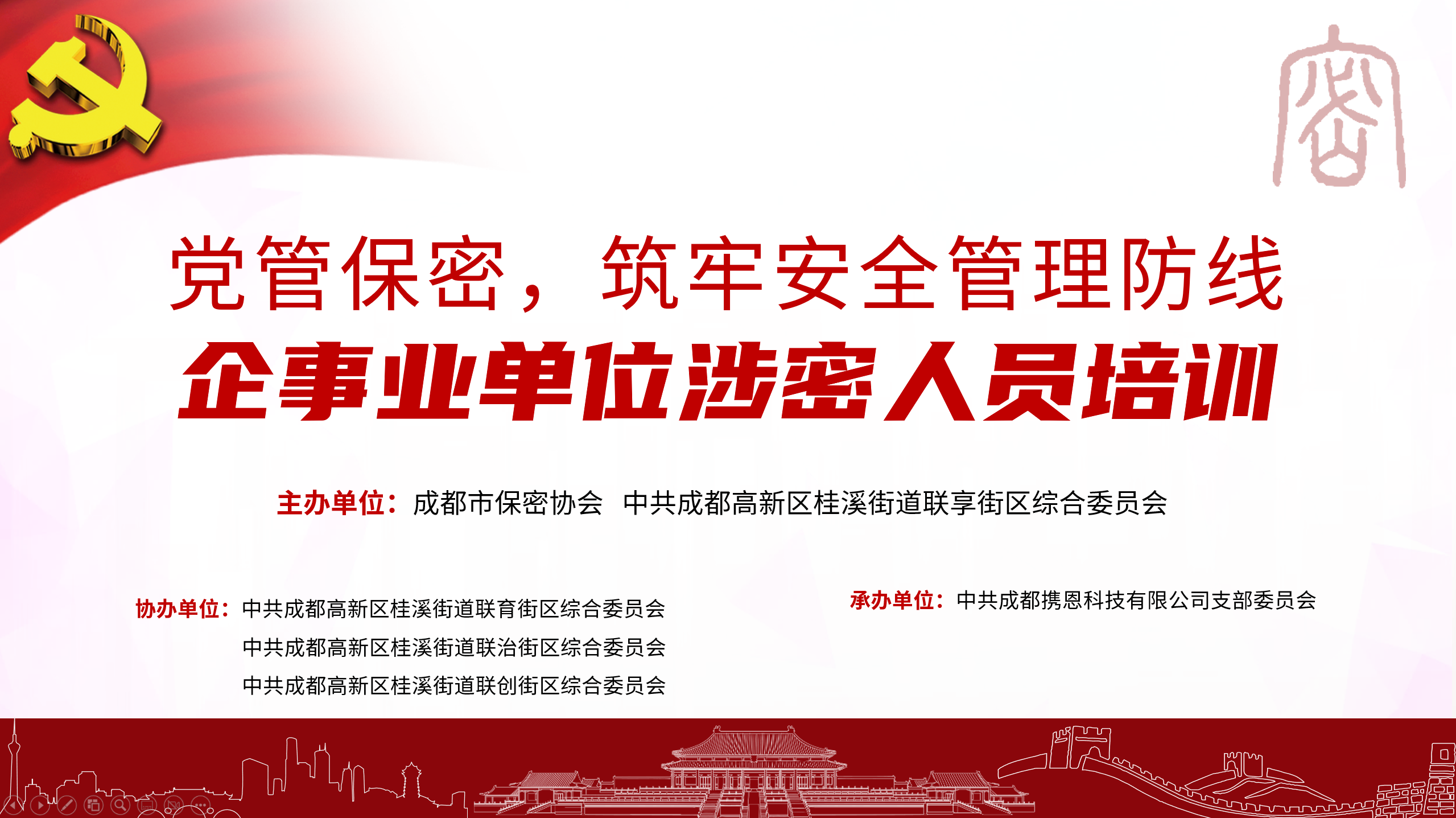 本次培訓(xùn)由成都市保密協(xié)會(huì)、中共成都高新區(qū)聯(lián)享街區(qū)綜合委員會(huì)主辦;中共成都高新區(qū)聯(lián)育街區(qū)綜合黨委、聯(lián)治街區(qū)綜合黨委、聯(lián)創(chuàng)街區(qū)綜合黨委協(xié)辦;中共成都攜恩科技有限公司支部委員會(huì)承辦。