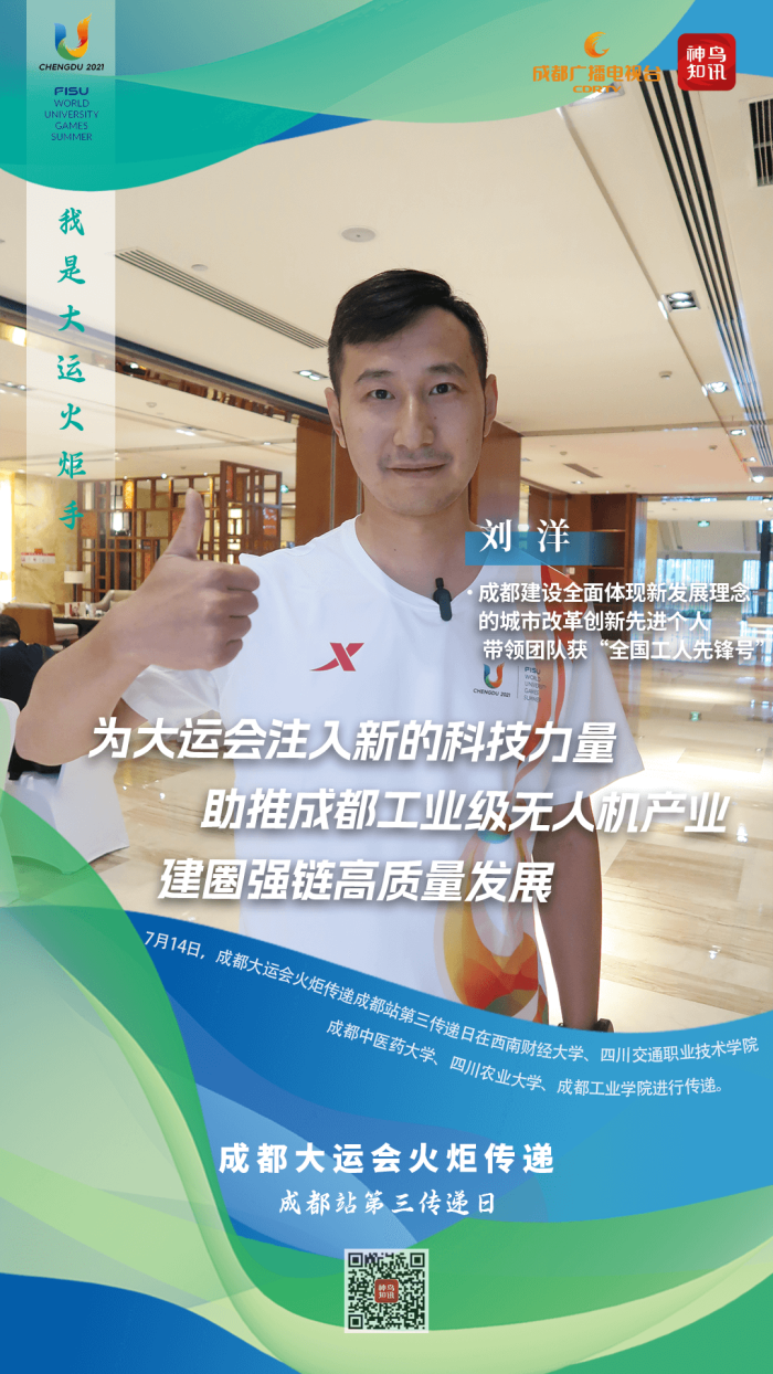 “機會難得!也很榮幸能成為成都大運會火炬手?!? 從“大學(xué)生創(chuàng)業(yè)軍”里成長起來的劉洋表示,“在大運會舉辦和‘智慧蓉城’建設(shè)的背景下,此次大運會也是時代的機遇,也希望能為大運會注入新的科技力量,同時助推成都工業(yè)級無人機產(chǎn)業(yè)建圈強鏈高質(zhì)量發(fā)展。”